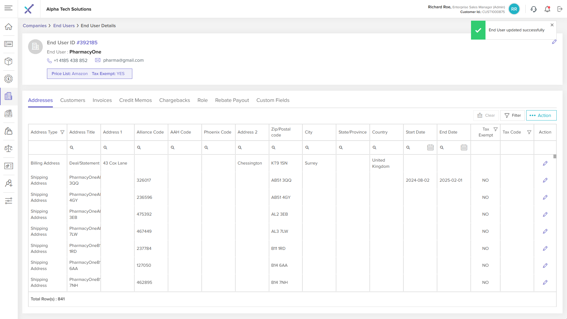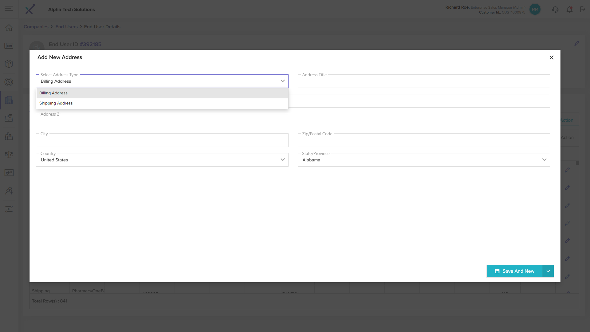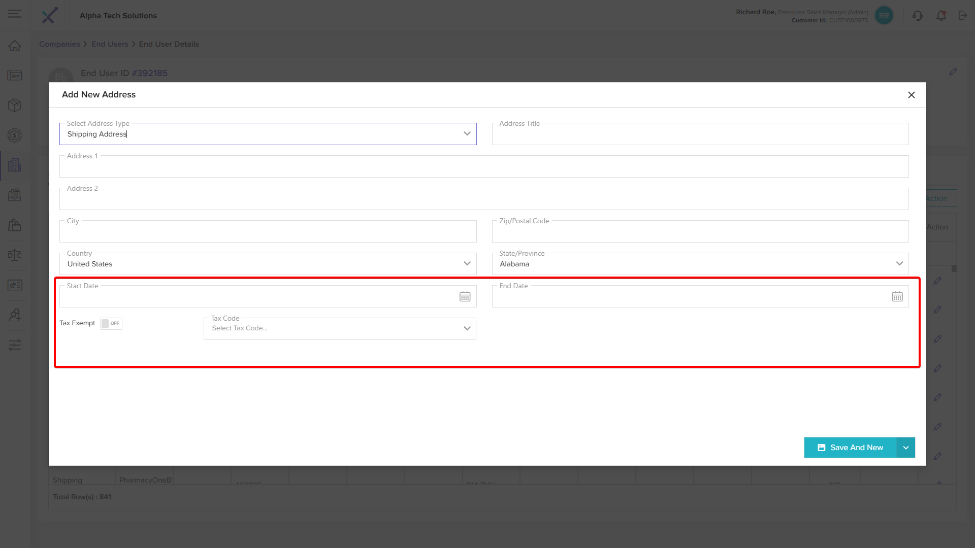Note: When you select Shipping Address system will display Start Date, End Date and Tax-Exempt fields