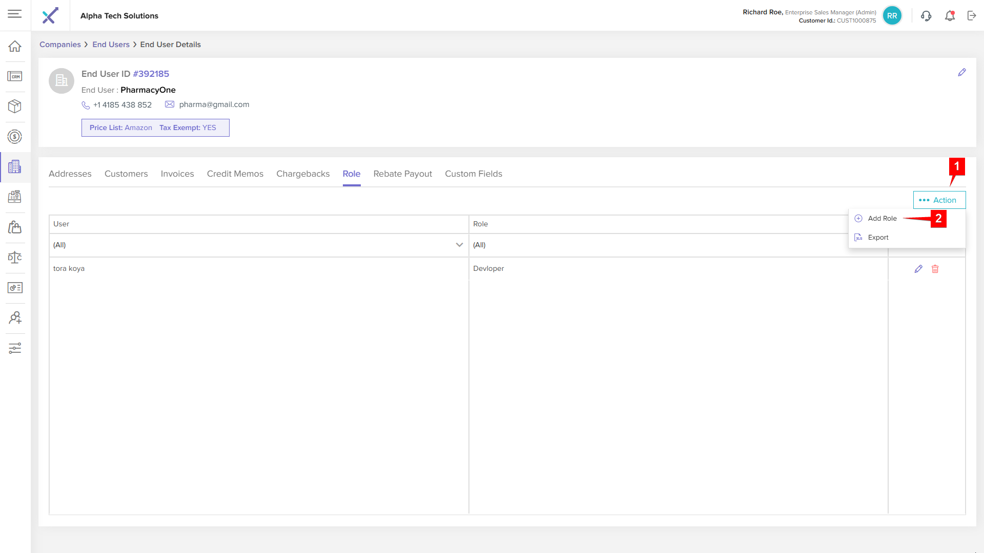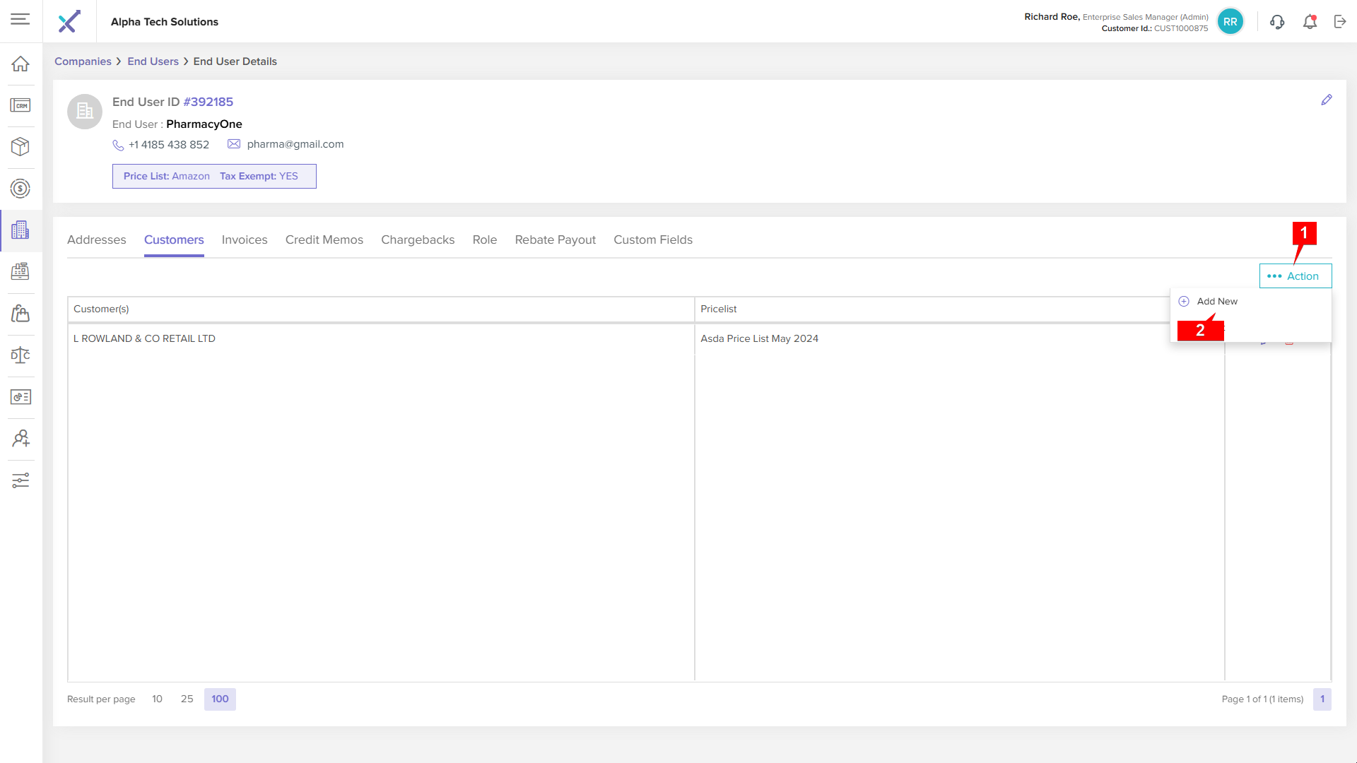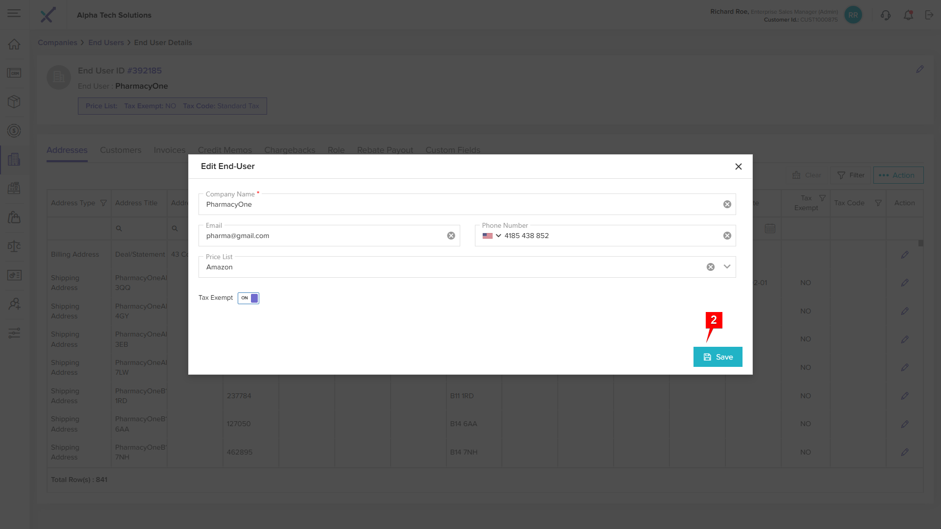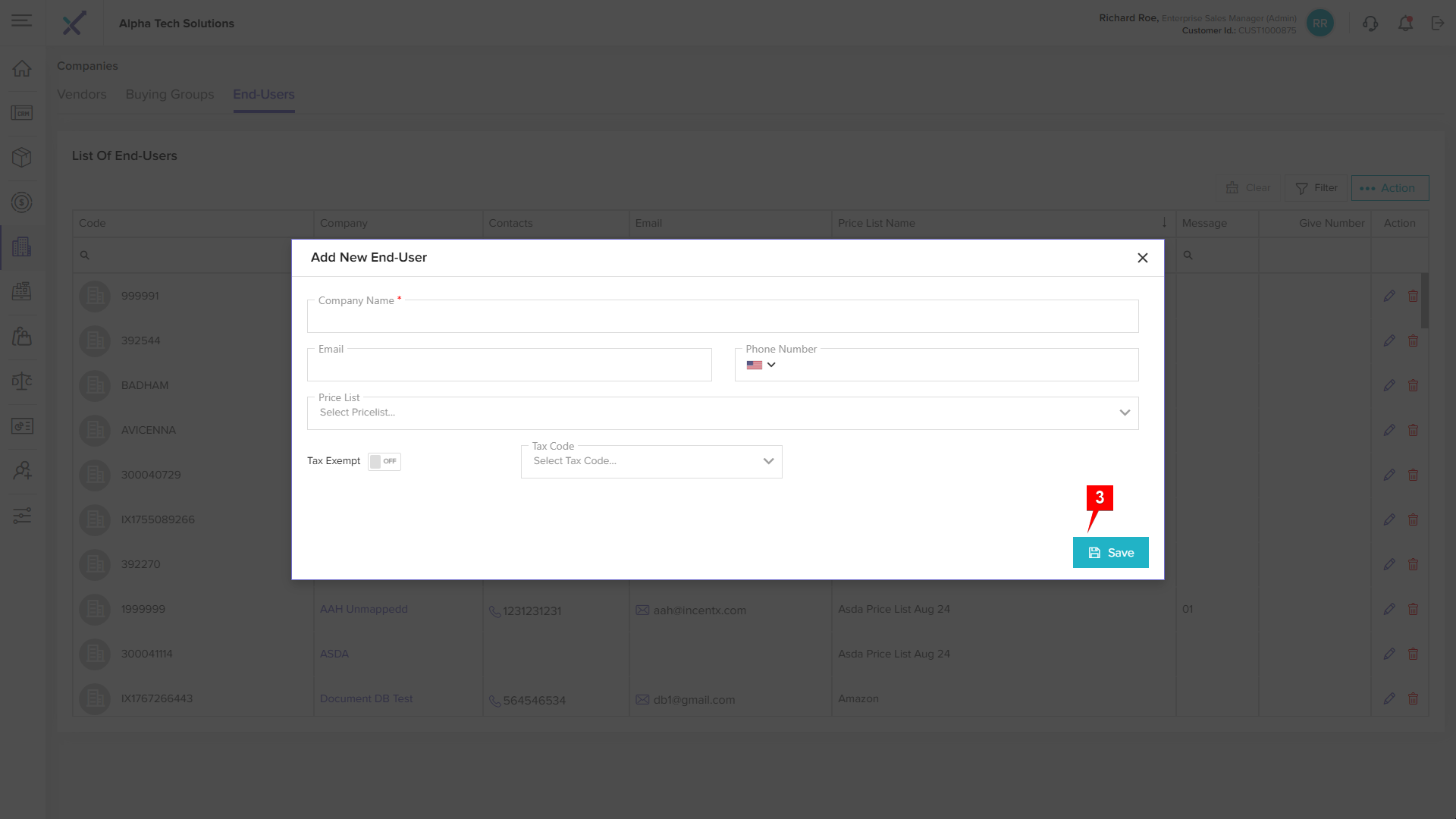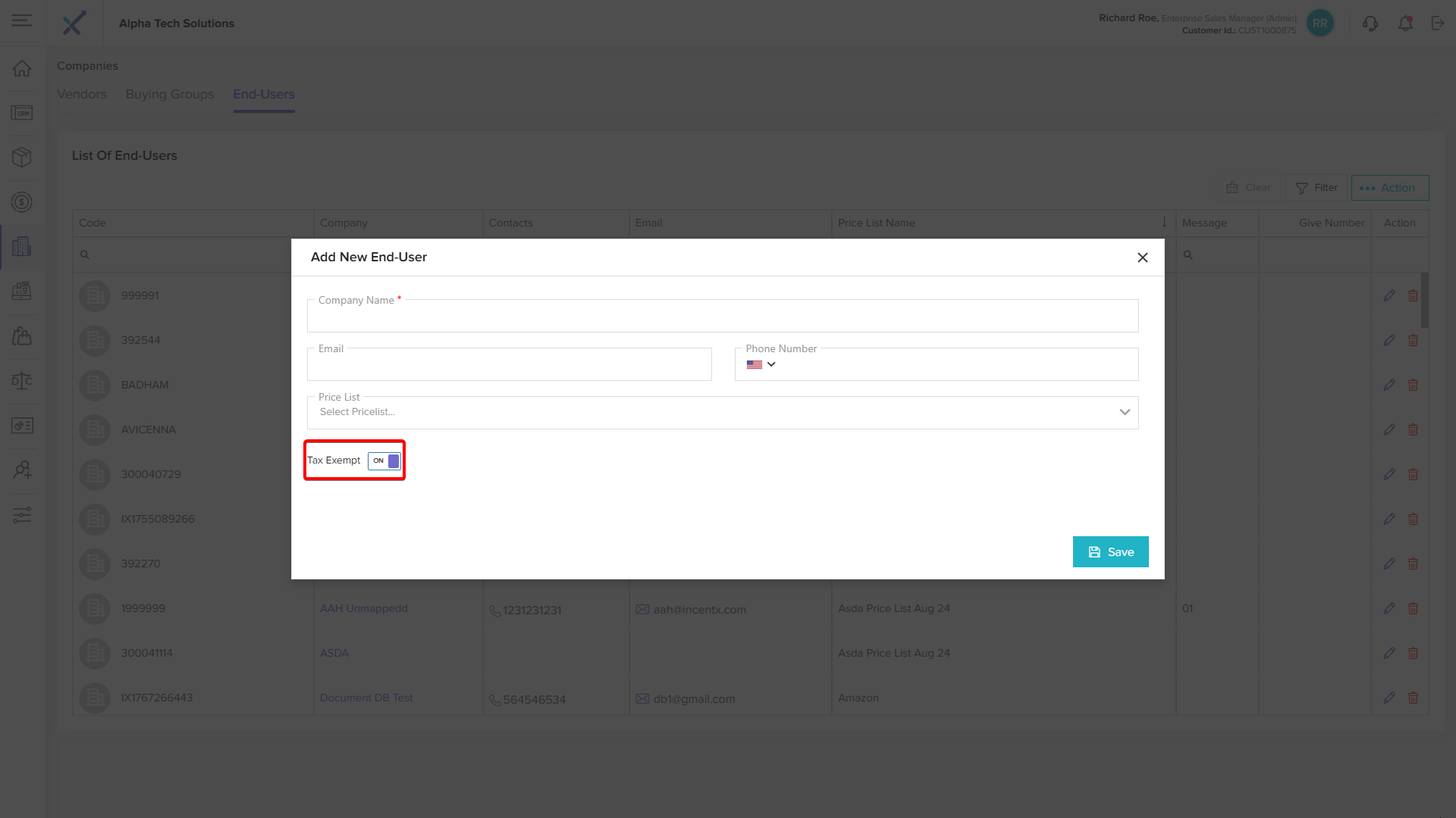 Customers Customer Listing Customer Creation Step 1: Click the Action button Step 2: Select Add New to open the customer creation form Note: When Tax Exempt is enabled, the Tax Code selection will be removed Step 3: Fill all the details as per fields ...